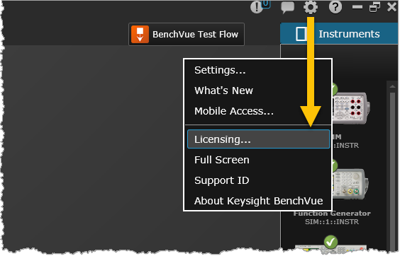 After launching the BenchVue Lab application, go the Global Settings (gear) menu and select "Licensing...".