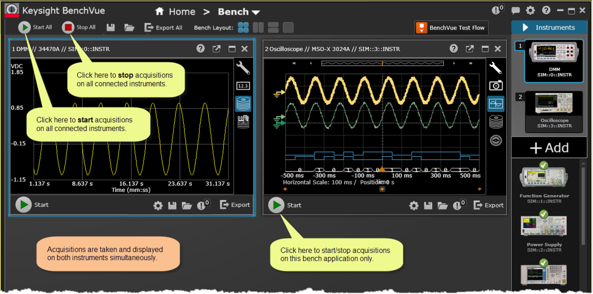 One of the key features of the BenchVue application is that you can simultaneously control multiple connected instruments. This allows you to create a "virtual" workbench of instruments all running simultaneously within one instance of the BenchVue software.