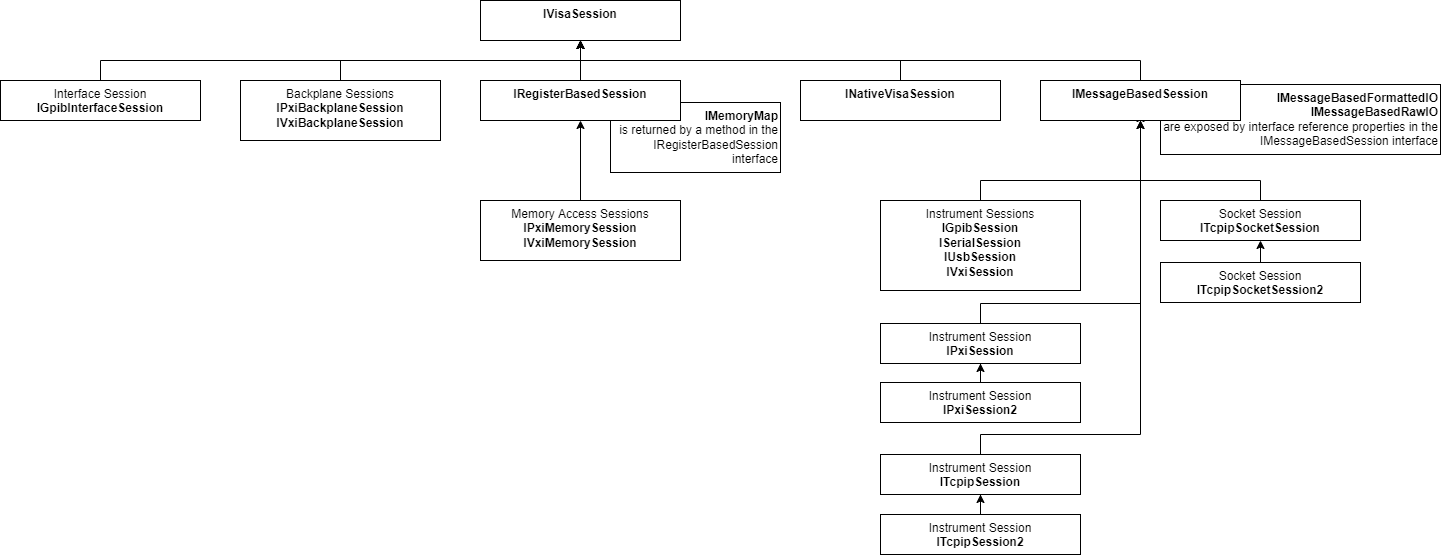 The following diagram shows the relationships among the interfaces defined in the Ivi.Visa namespace. Note that the relationships between resource types and message-based vs. register-based sessions are not as intuitive as might appear. For example, ITcpipSocketSession derives from IMessageBasedSession despite the fact that it is not an instrument session. Note also that IGpibInterfaceSession uses message-based Raw I/O, not Formatted I/O.