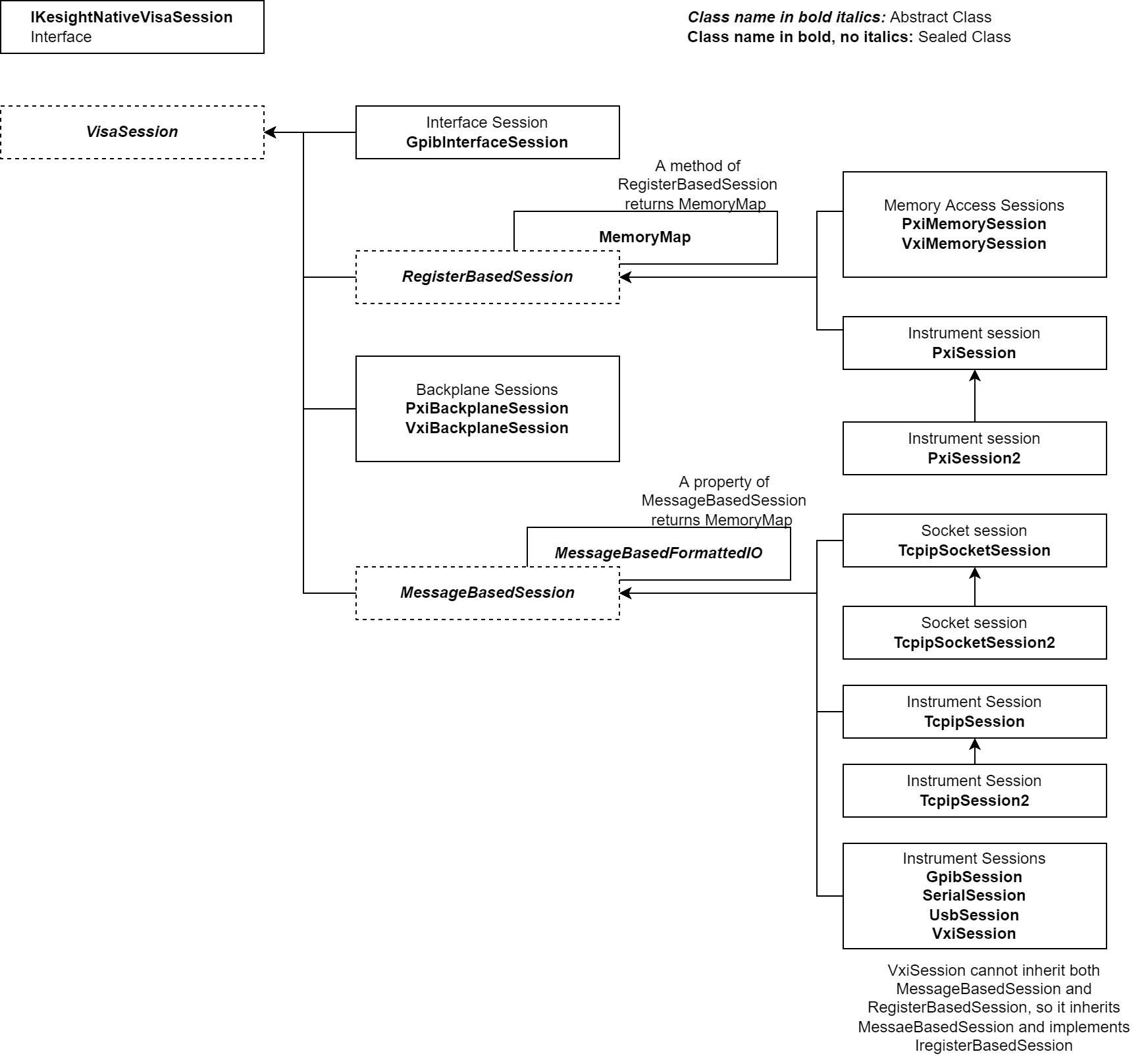 The following diagram shows the relationships among the classes and interfaces defined in the Keysight.Visa and Ivi.Visa namespaces. Note that the relationships between resource types and message-based vs. register-based sessions are not as intuitive as might appear. For example, TcpipSocketSession derives from MessageBasedSession despite the fact that it is not an instrument session.