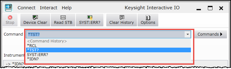 To display a command history and select from a list of recently used commands, click the drop-down arrow in the Command query field. (The Windows product is shown, but Linux functionality is the same).