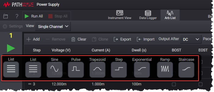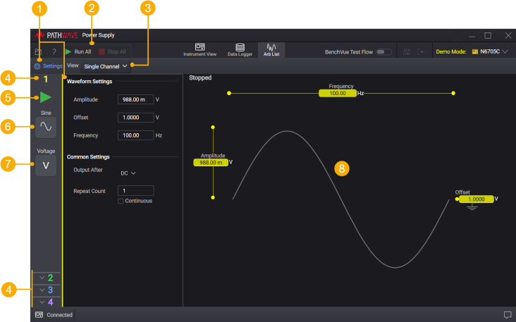 | 1 | Settings – Show or hide the Waveform Settings tab to change settings for built-in Arb waveforms. This is not applicable for List. |