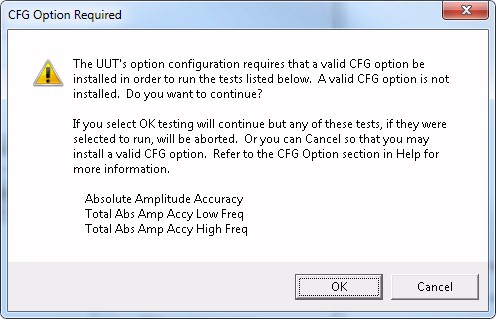 If a test or adjustment requires the CFG Option, TME will verify if the option is installed. If the CFG Option is required but not installed, TME will display a dialog box. Below is an example. Note that the tests or adjustments listed in the dialog box will vary depending on model and option combinations.
