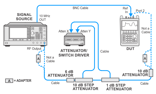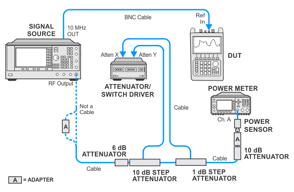 The 10 dB and 1 dB step attenuators are characterized at 50 MHz as a composite attenuator. The characterized loss is used to calculate the absolute input power to the DUT. The 1 dB attenuator is never allowed to drop below 5 dB in this test. The reason for maintaining 5 dB is so the mismatch with the cable is well controlled.
