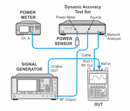 The Z5623A-H01 test set is used to measure dynamic accuracy of the A and B receivers down to -41 dBm. A reference power of -1 dBm is used for the test. Measurements are not made below -41 dBm because of noise interference at lower power levels.