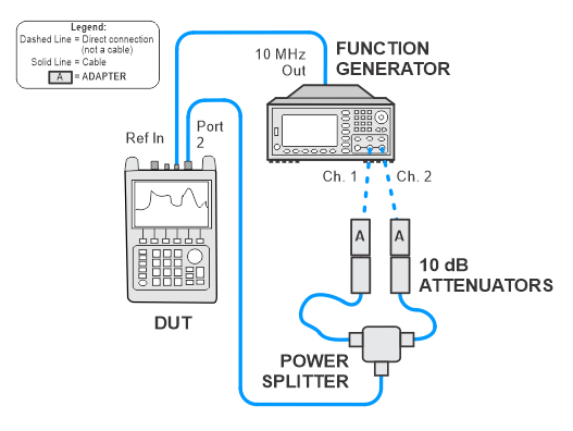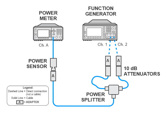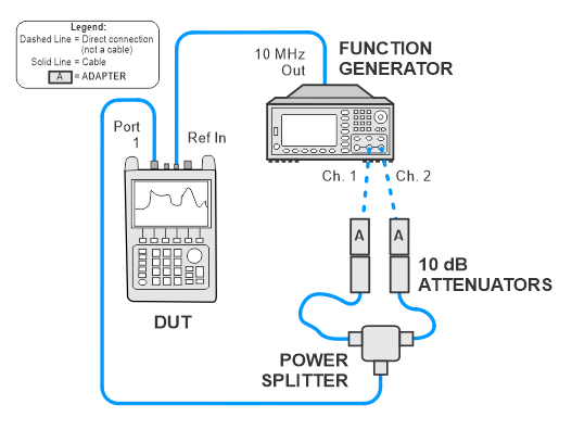 For the two cables between the power splitter and attenuators, choose short but flexible cables. For best results, the cable between the attenuator on channel 1 of the function generator and power splitter should be of longer length than the cable from the attenuator on channel 2 |