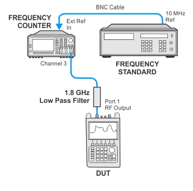 This test measures the accuracy of internal time base by measuring the frequency at RF OUT. A 1.8 GHz low-pass filter is used to attenuate harmonics generated by the source in the FieldFox analyzer.