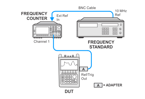 In this test the 10 MHz output is connected to a counter. The counter is locked to a reference that is 100 times more accurate than the signal analyzer time base. The 10 MHz output is measured by the frequency counter. The frequency is compared to the specification and a Pass/Fail determination is made.