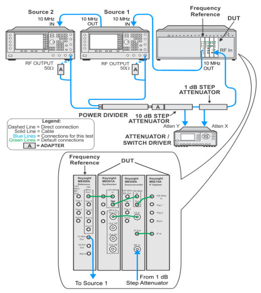 This test measures the amplitude linearity of the M9391A. Amplitude linearity is the amplitude accuracy over a range of input signals relative to an expected input level of +5 dBm. The test technique uses the two-source frequency offset method. The two source technique is accurate over small amplitude ranges, so step attenuators are used to step the amplitude over a wider range. The actual attenuator step loss is not critical as the measurement is re-referenced for each attenuator step. The linearity sections are then “stitched” together for all attenuator steps.
