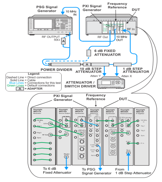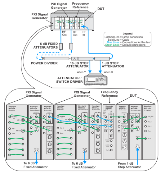 | The illustrations below show the recommended M9381A PXIe signal generator. If your setup is using the alternative M9380A PXIe signal generator, refer to the M9380A Startup Guide for the default cable interconnections. |