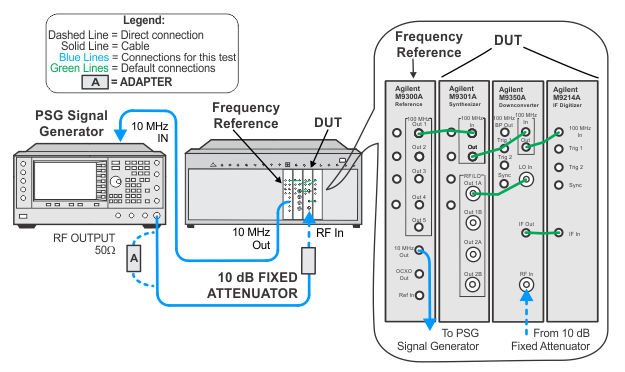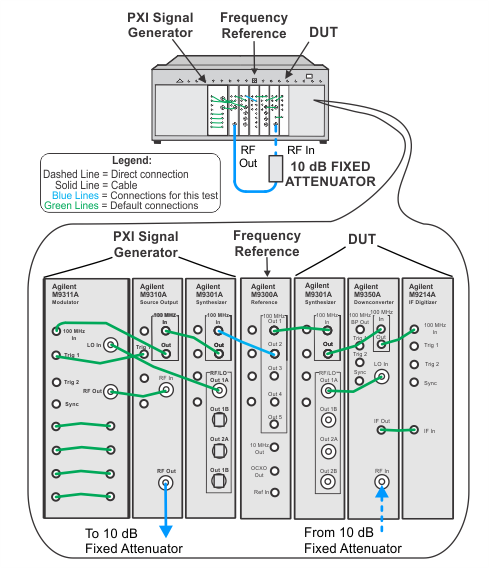 In this test a source is connected to the PXIe signal analyzer. The (UUT) attenuators are stepped by changing the “Expected Input Level” setting. The error is referenced to a –10 dBm Expected Input Level. The UUT display is used to measure the difference between the change in the internal attenuator.