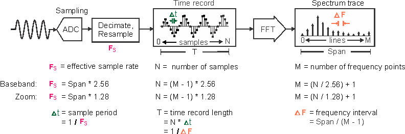 In the 89600 VSA, the interaction between the time and frequency domains starts with your selection of frequency and (M). From these selections, the VSA computes how much time data must be digitized in order to produce this frequency domain result. For more details, see Understanding Time and Frequency Parameters.