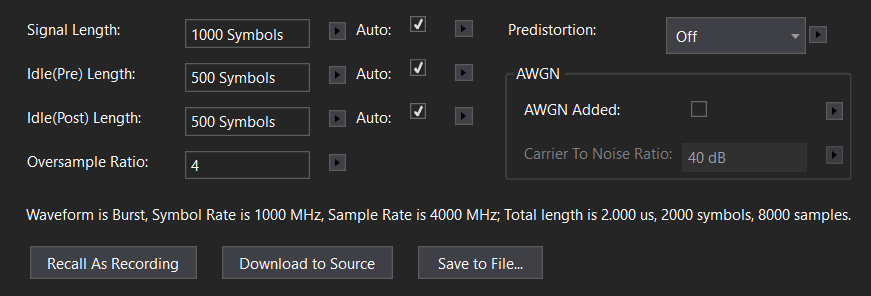 The Waveform Generation parameter group configures the settings needed to define the generated Flex Frame signal, predistort the waveform with the measured EQ response, add AWGN Additive White Gaussian Noise - Statistically random radio noise characterized by a wide frequency range with regards to a signal in a communications channel. and recall as a recording, save to a file or download to a source.