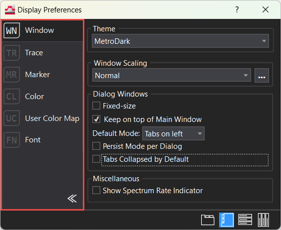 By default, Dialog window tabs are located on the left side of the window and expanded to show the full names of the tabs, as shown below. You can collapse the tabs to hide the full tab names to save space if desired by clicking