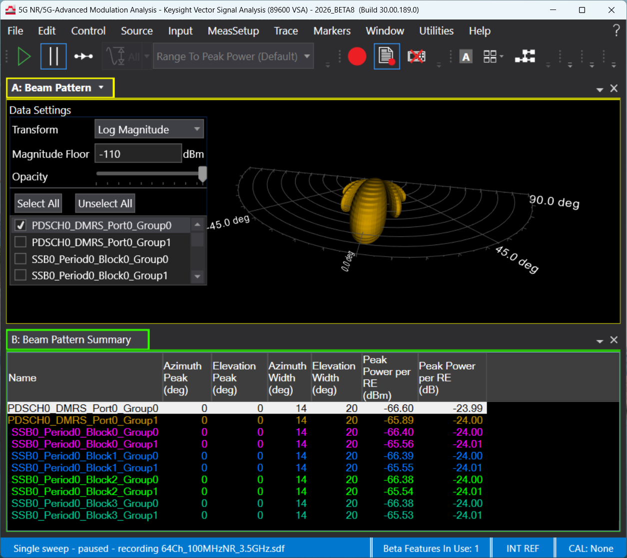 The Beam Patterns trace simulation is computed based on the model of the element radiation pattern configured by the Antenna Pattern properties group along with the physical antenna layout map that is configured using the Antenna Layout properties, and the Beam Weights trace data.