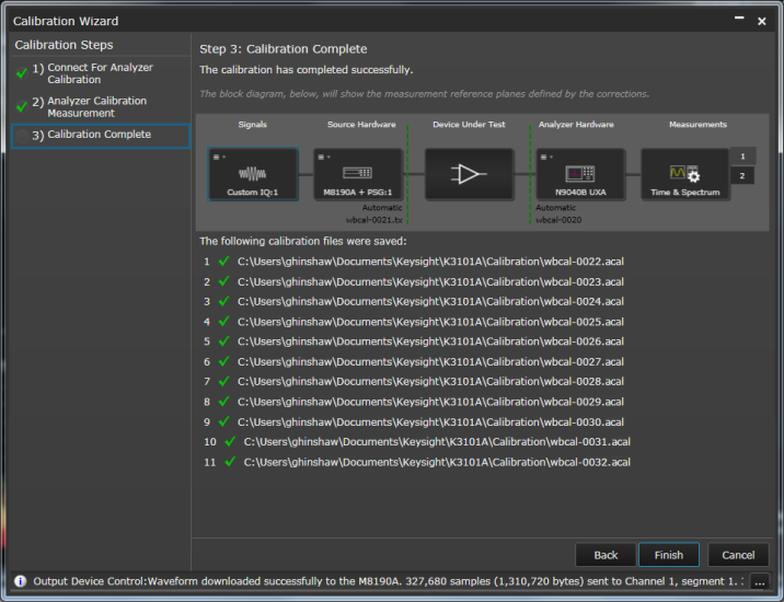 The Calibration Complete screen indicates the successful completion of an Analyzer Only multi-point calibration. It also lists the calibration files the Calibration Wizard created to correct for impairments in the connected measurement hardware.