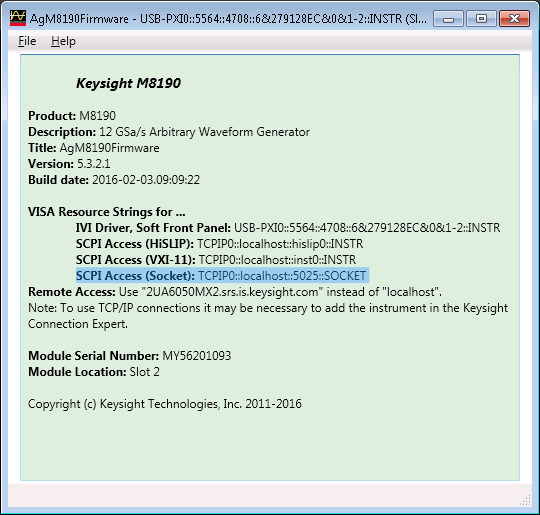 Use the “SCPI Access (Socket)” address. If using an embedded PC on the AXI chassis, this address will typically have <hostname> equal to the embedded PC hostname, and <socket> equal to 5025. If running the M8190A firmware on the same PC as Signal Optimizer, <hostname> will equal “localhost”, and <socket> will typically equal 5025. There are several scenarios that can override the default socket port numbers for the M8190A driver, so if connectivity cannot be established, please review the M8190A firmware window to confirm the address used by the M8190A.