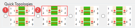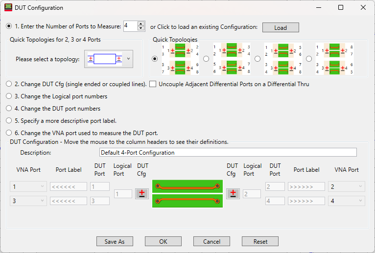 These selections are best made in the specified order. When each step is selected, the appropriate field in the diagram below becomes available and remains available while subsequent steps are selected. 1. Enter the number of DUT ports to calibrate and measure. Beginning with PLTS 2018, the maximum number of DUT ports is 64. Or click Load to recall a previously saved configuration (*.dcf) file. Quick Topologies for 2, 3, or 4 PortsFor convenience, when 2, 3, or 4 ports are selected, then select from the following topologies: 2-ports