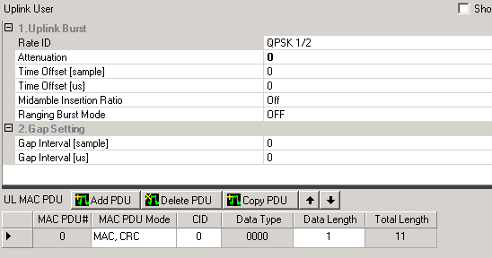 adds a user burst with a default MAC PDU. For each burst (maximum 16), a data grid displays parameters that you can edit by clicking each cell. You can also edit a full set of parameters and add up to eight MAC PDUs per burst in the UL User window. See Editing Tip. Editing Tip: In the MAC-Uplink Settings window, double-click the first column of the burst you wish to edit or click the burst of interest in the tree view. This displays the burst editing window. To return to the previous window, click MAC-Uplink in the tree view. See UL User for parameter definitions.