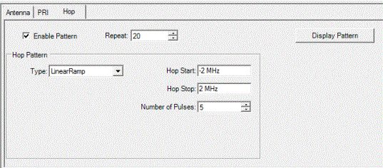Display Pattern on the Hop panel provides a plot of the frequency hop pattern data. The plot shows frequency versus repetition of pulses. The plot is based on the current Hop Pattern properties. You may zoom in on the hop pattern plot by clicking and dragging across the area of interest.