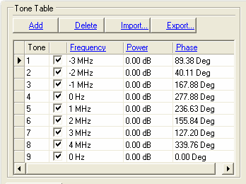 The tone table contains the definition of the multitone signal to be generated. Its values can be populated using the parameters in the Signal section or it can be edited directly.