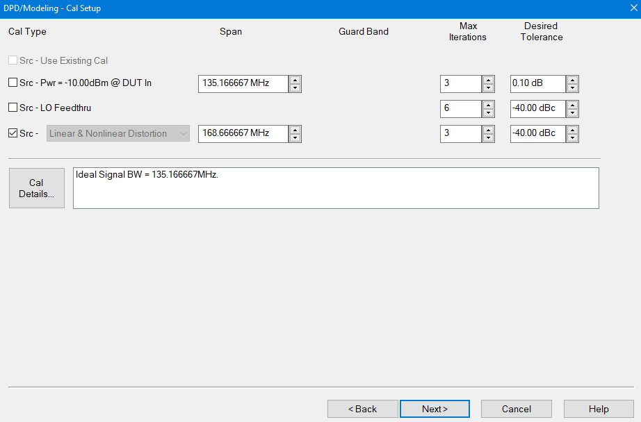 DUT - EVM - Value used to optimize distortion at the DUT output relative to the Ideal Waveform. DUT - ACP - Value used to optimize the upper and lower ACP bands at the DUT output. Src - Use Existing Cal - If the Ideal Waveform .mdx includes a source calibration, then this selection is available when Create DUT Model is the selected Procedure. If turned ON, then all other source cal choices (below) will be grayed out and disabled. Src - Power = -10.00dBm@DUT In - Calibrates the source power level at the -10dBm DUT input. Src - LO Feedthru - Calibrates the source LO feedthru at the DUT input. Src - Linear & NonLinear Distortion - Corrects linear and nonlinear distortion of the source at the DUT input. Span - Sets the span of the modulated signal or can be defined to also include upper and lower ACP bands. Guard Band - (DUT - ACP only) Sets the frequency delta from the edge of the carrier to the beginning of the ACP Span. The default is set to zero. This value is positive for both ACP Lower and ACP Upper. Max Iterations - The calibration routine uses successive approximation. This value sets the maximum number of iterations used by the calibration routine. Desired Tolerance - Sets the desired tolerance for each calibration. Cal Details - Accesses the Cal Details dialog < Back button - Accesses the DPD Select Procedure dialog. Next > button - Accesses the Calibrate dialog.