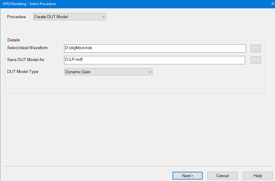 Create Modeled DPD procedure with Dynamic Gain DPD model. Note: License S94802B "Millimeter-wave component modeling" is required for the use of DPD with Dynamic Gain above 50 GHz.