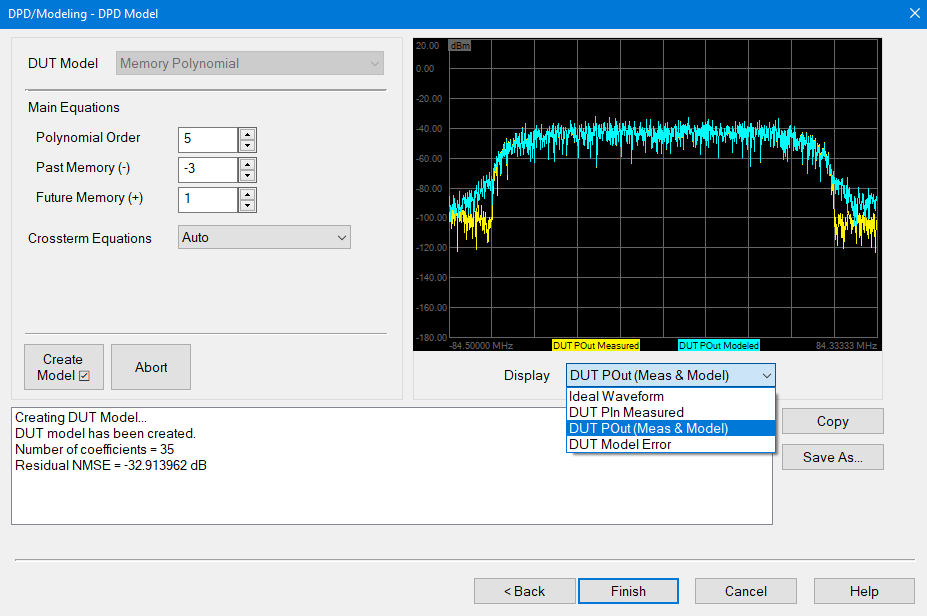 Abort button - Aborts the model creation process. Display - Choose from the following display selections: Ideal Waveform Displays the original waveform selected in the DPD Select Procedure dialog. DUT Pin Measured Displays the measured DUT input DUT Pout (Meas & Model) Displays two traces for the DUT output. Meas Pout" is the measured DUT Pout. "Model Pout" is the result of applying the DUT model to the Measured DUT Pin. DUT Model Error Display the difference between "Meas Pout" and "Model Pout" as described above.