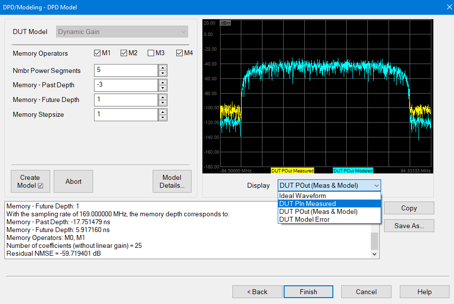DUT Model - Displays the DUT model. The DUT model selection must be done on the first page of the wizard, see the Dialog for Create DUT Model. Memory Operators - Selects the memory operators used for characterizing the device. By default, operators M1,M2 and M4 were selected. Nmbr Power Segments - Specifies the number of power segments. The input power range is split into separate segments, where each segment has its own look-up-table. Memory - Past Depth -Defines the memory depth for past samples used with the memory operators. This is an integer less than or equal to zero. Memory - Future Depth - Defines the memory depth for future samples used with the memory operators. This is an integer more than or equal to zero. Memory Stepsize - Defines the step size between samples used. A Memory Stepsize of 2 means every other sample will be used. If (Future Memory - Past Memory)/(Memory Stepsize) is not an integer, then (Future Memory) will be increased to make it an integer. Create Model button - See above Abort button - See above Display - See above Model Details - Opens the Model Details dialog.