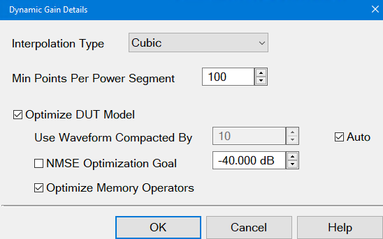Interpolation Type - Selects the interpolation type used in the AM/AM and AM/PM segments. Choose Spline, Cubic or Linear, default is Cubic. Min Points Per Power Segment - Sets the min points used in the AM/AM and AM/PM segments. The default is 100. If the user select too many segments, then the number of segments will be reduced until each segment has at least " min points". Optimize DPD Model - If selected, DPD will iterate over the Past Memory, Future Memory and Number of Power Segments to find the lowest NMSE. Use Waveform Compacted By - Compacting the waveform enables faster optimization.