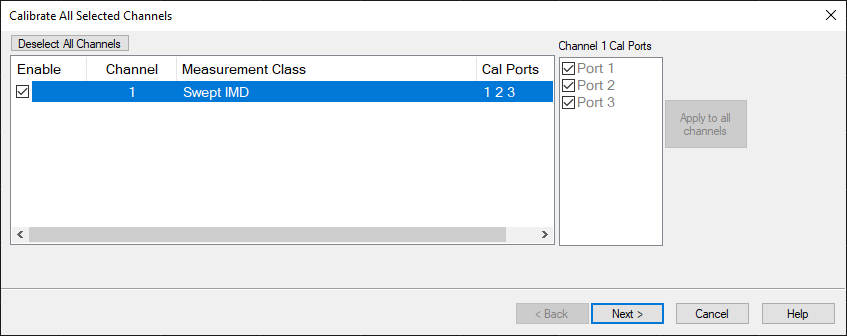 Receiver calibrations that are performed in a standard channel can be applied to a Swept IMD channel. However, Source Calibrations can NOT be applied.