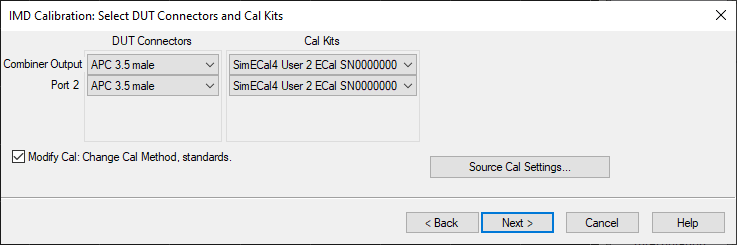 Select DUT Connectors and Cal Kits - IMD Cal dialog box help |