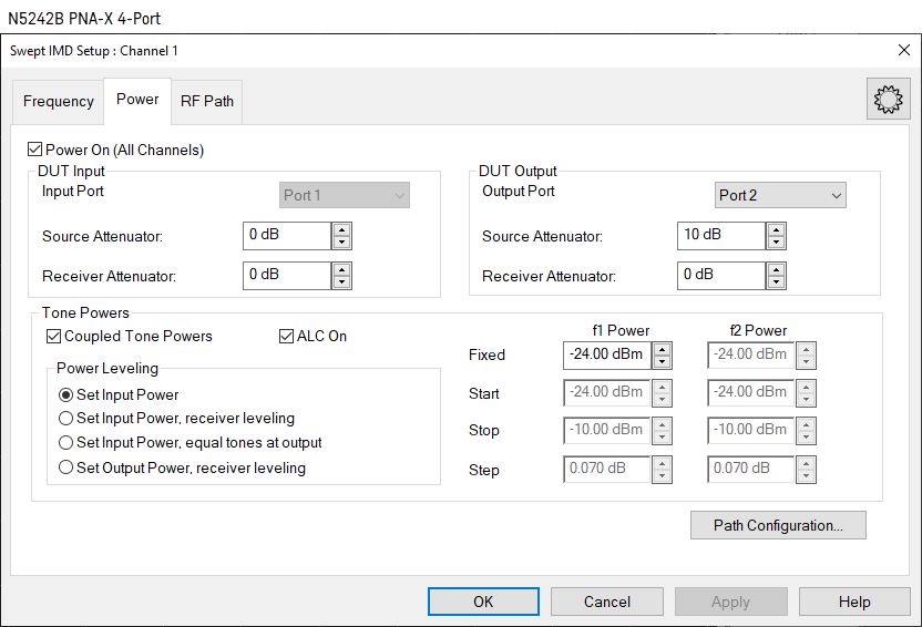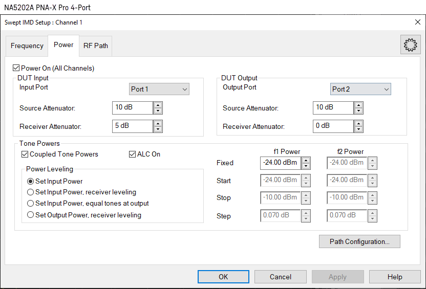 Configures RF power and Power Sweep settings for IMD measurements. Power ON (All channels) Check to turn RF Power ON or clear to turn power OFF for all channels. DUT Input PortInput Port Choose Port 1 or Port 3. When using Port 3, an external combiner is required. PNA-X Pro allows you to select port 1 or 2; external combiner not required. Learn more. Source Attenuator Specifies the port 1 attenuator. This attenuator affects the range of available power into the DUT Learn more about Source Attenuation. Receiver Attenuator This attenuation setting protects the A receiver from damage. For PNA-X Pro, if input is set to port 1 then this is the R1 attenuator. If input is port 2 then this is R2 attenuator. DUT Output PortOutput Port Choose Port 2 or Port 4 (with limitations). For PNA-X Pro output may be Port 1, 2, 3, or 4, but with limitations. Learn more. Source Attenuator This setting is used to improve the load match at the DUT output. Select 0 dB for power levels up to 10 dBm, and increase by 10 dB for every 10 dBm more output power. Receiver Attenuator Specifies the attenuator setting for port 2. When the power into the receiver test port is around +10 dBm, the VNA receiver may be in compression. However, with receiver attenuation, lower input power levels may become too noisy to make accurate power measurements. In this case, lower IFBW for the IM tones to reduce noise. Learn more about Receiver Attenuation. Tone PowersCoupled Tone Power Check to set the same power level for each main tone using the f1 Power setting. Clear to set different f1 and f2 power levels. ALC On Check to use internal ALC hardware (default). Clear to use Open Loop hardware. Open Loop leveling should only be used when doing Wideband Pulse measurements. Power LevelingBecause the gain of the DUT can be different for the f1 and f2 tone frequencies, you can set tone power at either the input of the DUT OR the output using the following methods. Receiver Leveling will cause slower sweeps. Set Input Power (Default) The specified f1 and f2 power levels are set at the DUT input. Input power level accuracy is based ONLY on the source power cal that is performed during the IMD cal. The input and output tones may NOT be equal or flat. Set Input Power, receiver leveling The specified f1 and f2 power levels are set at the DUT input using receiver leveling at the input reference receiver. This ensures the tone power levels are equal at the DUT input. However, the output tones may NOT be flat due to variations in the gain of the DUT at different frequencies. Set Input Power, equal tones at output The specified f1 and f2 power levels are set at the DUT input and a measurement is made at the output. The inputs are adjusted once at each frequency to ensure the tone power levels are equal at the DUT output. However, the output tones may NOT be flat due to variations in the gain of the DUT at different frequencies. Set Output Power, receiver leveling The specified f1 and f2 power levels are set at the DUT output. Receiver Leveling at the output receiver is used to accurately set the specified power level of each tone within the tolerance value that is set in the Receiver Leveling dialog. This setting results in the output tones being equal and flat across the frequency range. Note: Enabling Safe Mode when using receiver leveling may be necessary to ensure stable results. f1 / f2 PowerFixed f1 Power Specify the power level for f1 at either the DUT input or output depending on the Power Leveling setting. Choose a value between -30 dBm and +30 dBm. When "Coupled Tone Power" is checked, power is set for both f1 and f2 tones. Fixed f2 Power Available when Coupled Tone Power is NOT checked. Specify the power level for f2 at either the DUT input or output depending on the Power Leveling setting. Choose a value between -30 dBm and +30 dBm. Start, Stop, and Step f1 and f2 Power Available when Power Sweep is selected on the Frequency tab. Sets the Start and Stop power levels for f1 and f2, either individually or together with Coupled Tone Power checked. Path Configuration (PNA-X models) Click to launch the Path Configuration dialog. Path Configuration (PNA-X Pro models) Click to launch the RF LO IF Path Configuration dialog. Highlighted Note: RF2 tone power offset to compensate for combiner loss. This message appears when the f2 tone is being supplied by an external source. The tone power has been increased on the external source to compensate for loss through the internal combiner. For example, if the tone power at the DUT should be 0 dBm, the power out of the source will be about 15 dB higher. |