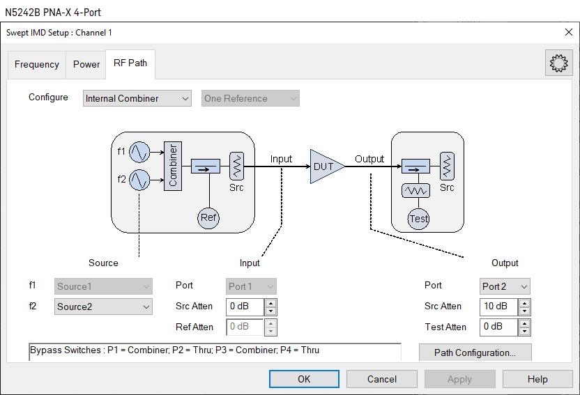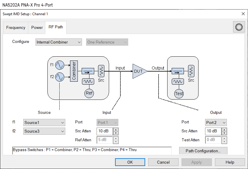 Source ConfigurationSource These combo boxes allow you to select internal sources and previously defined external device sources. "Add Source..." opens the External Device Configuration dialog for defining other sources. To accommodate single-source VNA models, an external source can be used for the f2 tone. f1 Always uses VNA internal source 1. f2 Select a source to be used for the f2 tone. This selection is available when an external source is configured and the "Active" box is checked on the External Source Configuration dialog. Learn how to configure an external source and combiner to make Swept IMD and IMDx measurements. Input 1 This defines the DUT input connection #1. (If only one input, then number is not displayed.) Port = VNA port number connected to the DUT input #1. Src Atten = VNA source attenuator setting for the selected VNA port. Ref Atten = VNA reference receiver attenuator setting for the selected VNA port (not available in all versions). Input 2 This defines the DUT input connection #2. (If only one input, then not displayed.) Port = VNA port number connected to the DUT input #2. Src Atten = VNA source attenuator setting for the selected VNA port. Ref Atten = VNA reference receiver attenuator setting for the selected VNA port (not available in all versions). Output This defines the DUT output connection. Port = VNA port number connected to the DUT output. Src Atten = VNA source attenuator setting for the selected VNA port. Test Atten = VNA test receiver attenuator setting for the selected VNA port (not available in all versions). Path Configuration (PNA-X models) Click to launch the Path Configuration dialog. Path Configuration (PNA-X Pro models) Click to launch the RF LO IF Path Configuration dialog. |