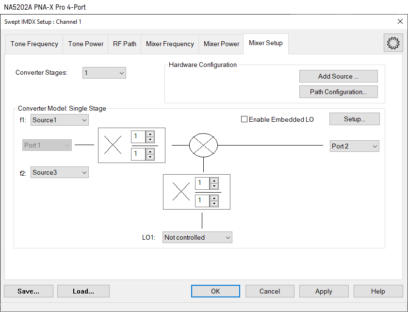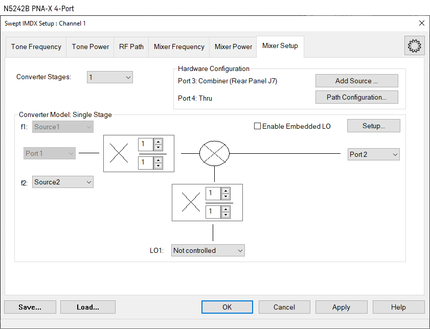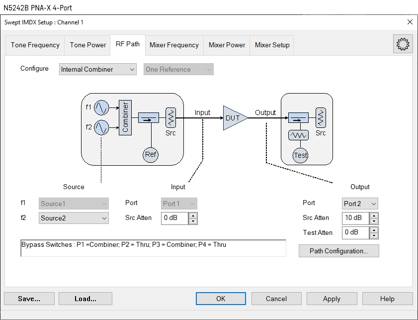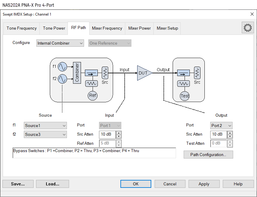 Converter Stages Choose from 1 or 2 stage DUT (# of LOs). Converter ModelLearn how to configure an external source and combiner to make Swept IMD and IMDx measurements. f1 Always uses VNA internal source 1. This is a live combo box, displaying the same value found on the RF Path tab. Input (Port n) Normally Port 1 is used. This selection is available to allow the two tones to be routed through port 3 on 4-port VNA models. Learn more. If the configuration is "Internal Combiner," (PNA-X and PNA-X Pro only) then this is a single combo box which displays the same value as found on the RF Path tab.