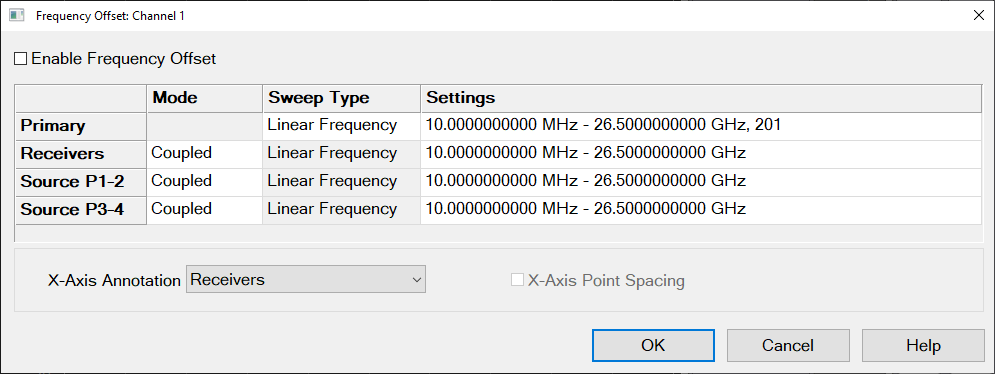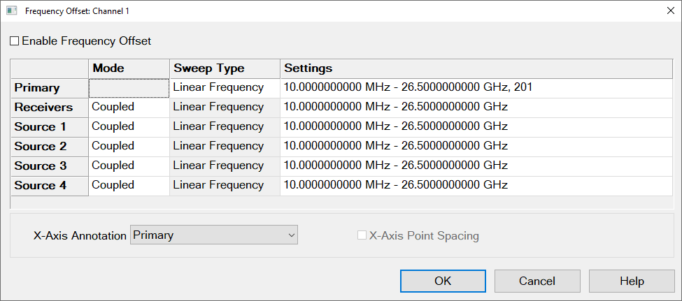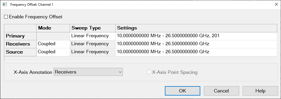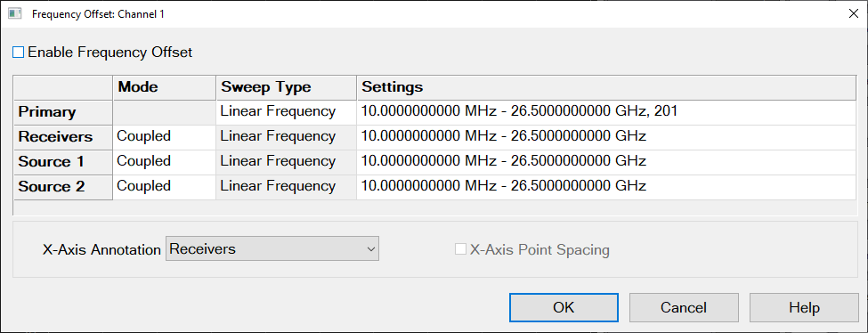 Note: When Frequency Offset is enabled, ALL receivers on the channel, including the reference receivers, tune to the new offset frequencies, Therefore the source and reference receiver will be at different frequencies. Therefore, FOM measurements that include a reference receiver, which includes all S-parameters, display invalid data. To measure and display measurements at both the source and receiver frequencies, you must use two channels. Use Equation Editor to calculate the conversion loss. See a calibrated FOM conversion loss example. |
