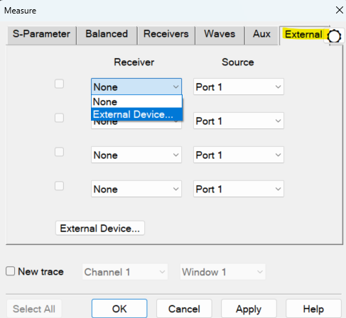 Receiver Allows users to select the external receiver. Will show all external receivers (Power Meter, DC Meter and SMU) defined in the External Device Configuration dialog which have "Active - Show in UI" enabled. Source Select the active source for the measurement. New trace Click to allow multiple external receiver traces to be selected. If "New Trace" is enabled, then multiple checkboxes maybe selected. External Device... Click on this button will open the External Device Configuration dialog. Channel / Window Selections