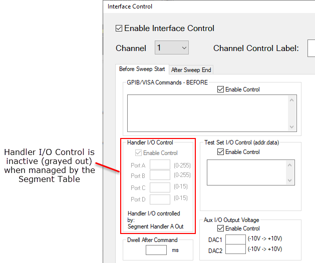 Control... - Opens the Interface Control dialog, allowing you to see the relationship between how the Material Handler is used with segments versus the Interface Control. If you are using segments (Handler Port A enabled), then the Handler I/O Control is inactive (grayed out).The Material Handler can only be controlled by one of these at a time.