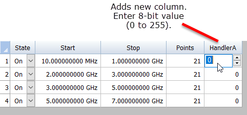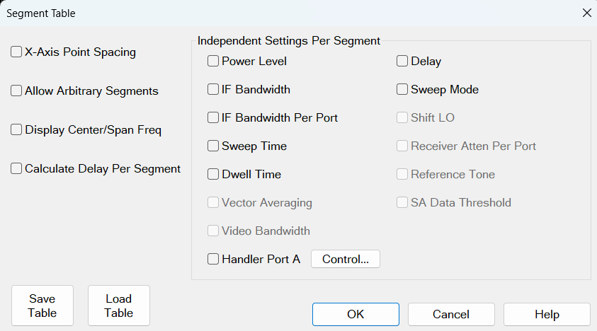 Independent Setting Per Segment Power Level - Sets the Power level for the segment. Also, the test port power can UNCOUPLE. See Power Coupling. IF Bandwidth - Sets the IF Bandwidth for the segment. IF Bandwidth Per Port - Sets the different bandwidth with different port for the segment. Sweep Time - Sets the Sweep time for the segment. Dwell Time - Specifies the time the source stays at each measurement point before the analyzer takes the data. Vector Averaging - Enables SA vector average for the segment. Video Bandwidth - Enables SA video bandwidth for the segment. Handler Port A - Enables/Disables Material Handler Port A Output (8-bit output on the rear panel) by segment. When enabled, the "HandlerA" column is added to the Segment Table where you can enter an 8-bit value (0-255). Learn more. Note: By default, the Material Handler output uses negative logic. Refer to CONTrol:HANDler:LOGic for setting it to positive logic.