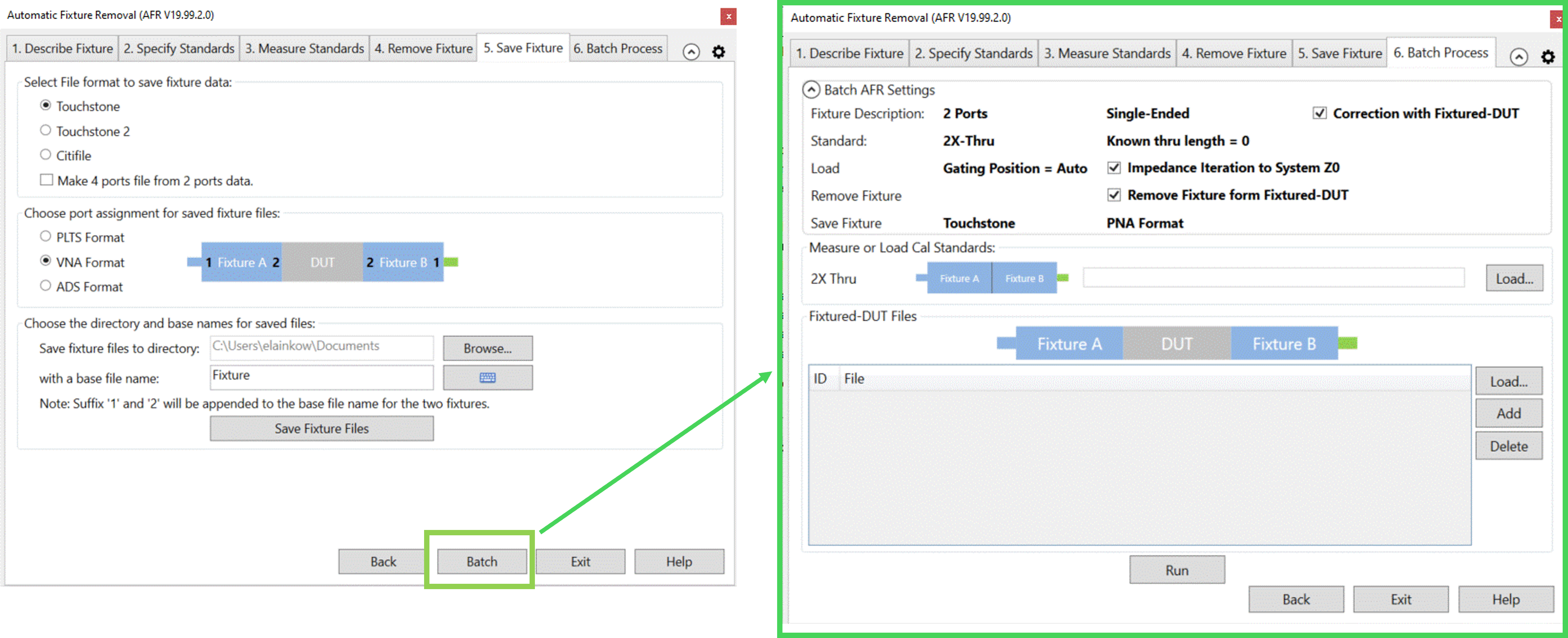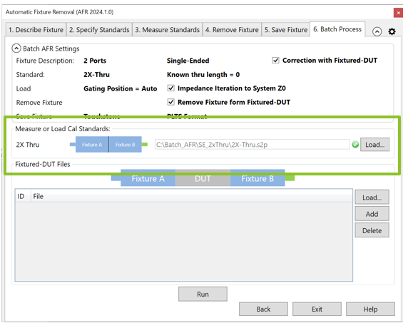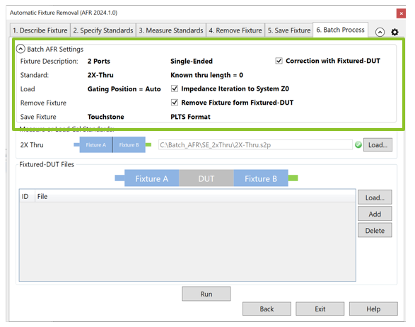 Batch AFR facilitates the AFR when you have multiple fixtured-DUTs with the same 2x-Thru standards. You do not need to repeat the AFR wizard steps with batch process.