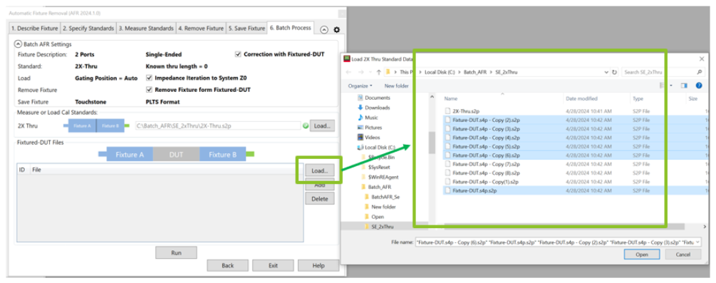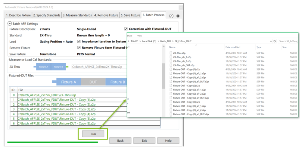 Click Run. The batch process saves the fixture with appendix _afr_1 as left fixture , _afr_2 as right fixture, and _afr_DUT as de-embedded DUT.