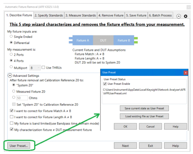 Measure or Load standards are the 2x-Thru standards of fixture. The default is the standard specified by previous AFR wizard. You can also load a different one by clicking the Load button.