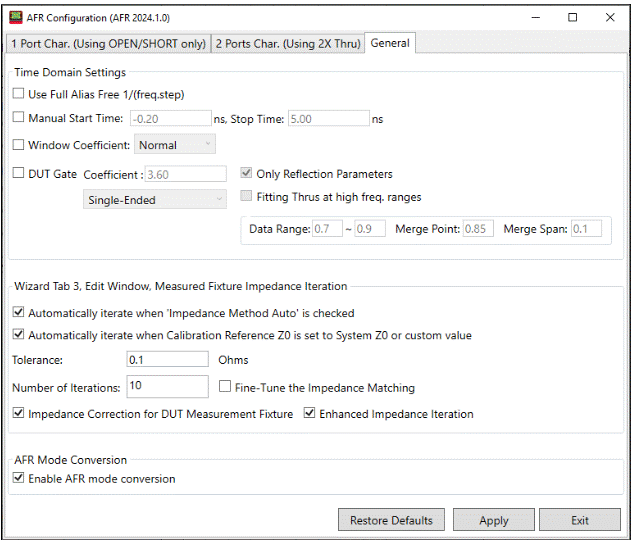 The Tolerance (in ohms) and Number of Iterations can be set under Wizard Tab 3, Edit Window, Measured Fixture Impedance Iteration. Also, two conditions for automatic iterations can be enabled via checkbox:
