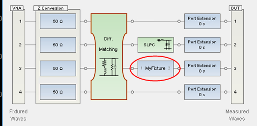 With the test fixture connected to the VNA and a DUT inserted, the measurement results now appear as though calibration was performed at the connections to the DUT, and the device was measured in a 50-ohm single-ended test environment. The following steps will cause the results to reflect the performance of the device as though the device is embedded in the circuit in which it will be used.