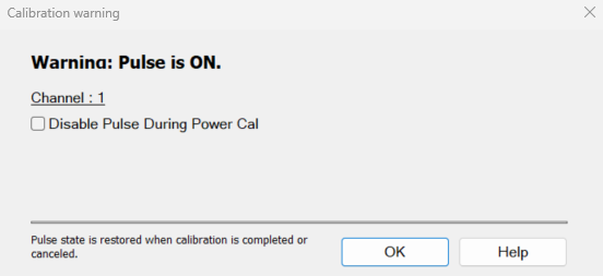 If a power cal is going to be performed on a source which has the RF Pulse Modulator enabled, a warning dialog is displayed when you click Measure.