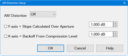Y-axis = Slope Calculated Over Aperture  Check to calculate the slope over the specified aperture. For AM-PM, the phase slope is shown in deg/dB. For AM-AM, the gain slope is shown in dB/dB. If this mode is not enabled, then the phase or power is normalized using the median linear gain of the first 30% of the trace.