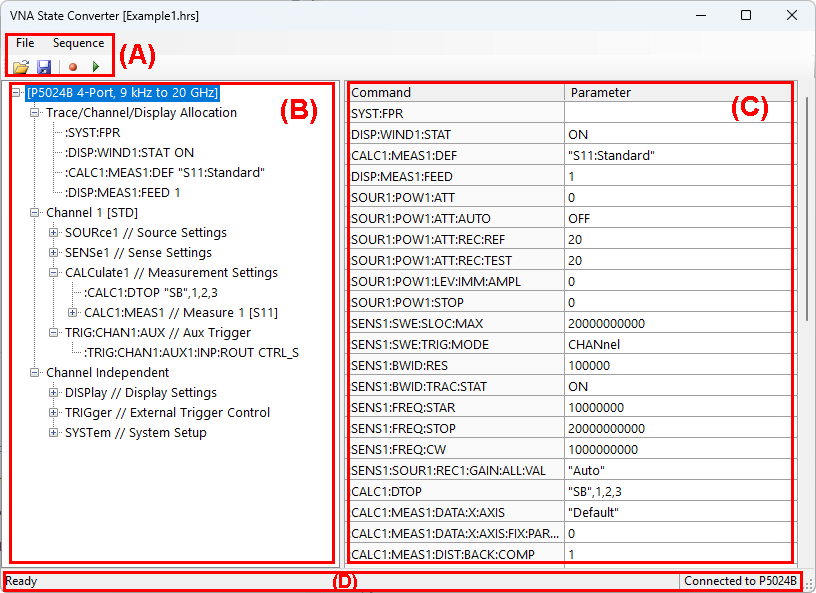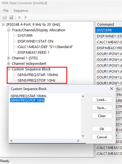 The VNA State Converter translates the VNA settings into SCPI command sequences. Then, the command sequence can be recalled and executed on another VNA unit.