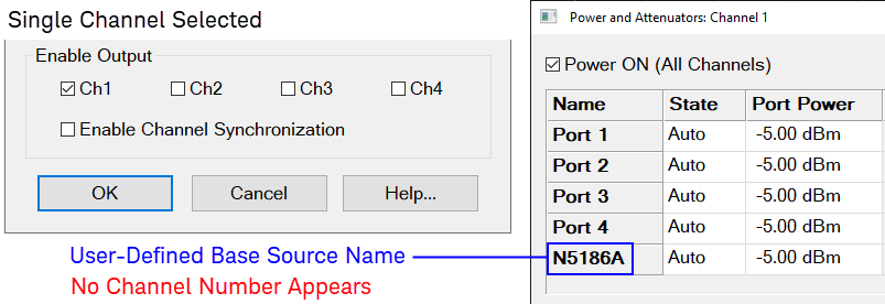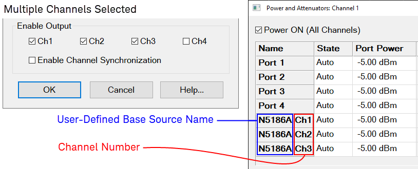 Enable OutputThis feature is available for connected external sources with one or more channels. Some measurements, such as wideband active load pull (WALP), require a source with multiple channels. A set of check boxes (Ch1, Ch2, Ch3, and Ch4) are provided for enabling these channels on the VNA. Each directly correspond to the RF output connectors of the source. For example, when an N5186A MXG is the external source, Ch1 controls the "1 RF Out" port. The dialog always displays four check boxes, even if the connected source has less than four RF outputs. In all cases, Ch1 is checkmarked by default. The channels you select appear in other related VNA dialogs, such as Power and Attenuators, Offsets and Limits, and Frequency Offset and Frequency Offset (NA520xA). In these cases, when there is more than one channel selected, the user-defined channel names are decorated, using “<Base Source Name> Ch <Chan Number>,” as shown below. Enable Channel Synchronization - Click this checkbox if your external source supports channel-phase synchronization. Note: If you are using Arbitrary Load Control (ALC) software with a VXG signal generator as the external source, channel-phase synchronization works for channels 1 and 2 only.