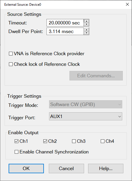 Source SettingsTimeout (sec) Sets the VISA timeout and will stop processing additional SCPI commands on the first error and will put the measurement into hold. Dwell per point (ms) Applies a dwell in Hardware List triggering ONLY. Set the time (in milliseconds) the external source will wait before data acquisition. Enable Modulation Control - Enables modulation of an external modulation source to be controlled from a source dialog. VNA is Reference Clock provider - Checking this box uses the VNA as the reference clock for the specified external source. Check Lock of Reference Clock IN - (SA and Modulation Distortion source drivers) Checks for the VNA's reference clock at the external source. The reference clock is checked at external source driver startup. If the clock is not available, an error message is displayed. If a dual hardware source is used (for example, M8190+PSG), the reference clock inputs of both sources are tested. In the case of the USB chassis (P9336A), the reference clock is tested at the rear 10 MHz chassis input if the P9336A 10 MHz chassis reference is selected. Edit Commands Provides a method to send SCPI commands to AGGeneric (not listed) sources. Trigger Settings and Physical Connection diagramsNote: The VNA controls ALL external source trigger settings automatically (except for those on this dialog). All settings in the External Trigger dialog are ignored. Trigger Mode Software CW (GPIB) Slowest method.