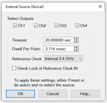 Select Outputs A single M5300x has four outputs, so it may be used to define up to four sources. Multi-channels can be selected at the same time. Timeout (sec) Sets the VISA timeout and will stop processing additional SCPI commands on the first error and will put the measurement into hold. Dwell Per Point (msec) Applies a dwell in Hardware List triggering ONLY. Set the time (in milliseconds) the external source will wait before data acquisition. Reference Clock There are two choices: Internal 2.4 GHz and External 2.4 GHz. Internal locks to the PXI_CLK100 backplane reference and generates 2.4GHz. External locks to the signal input on the "2.4GHz in" front panel connector. Default is "Internal 2.4GHz" Check Lock of Reference Clock IN (SA and Modulation Distortion source drivers) Checks for the VNA's reference clock at the external source. The reference clock is checked at external source driver startup. If the clock is not available, an error message is displayed.